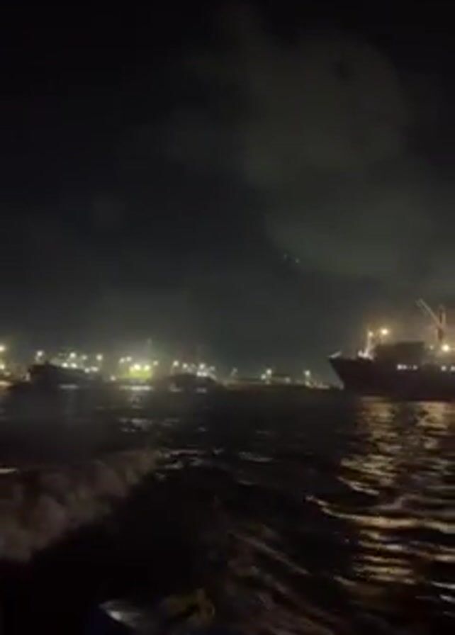 The video depicts a nighttime scene on the water, likely a harbor or port