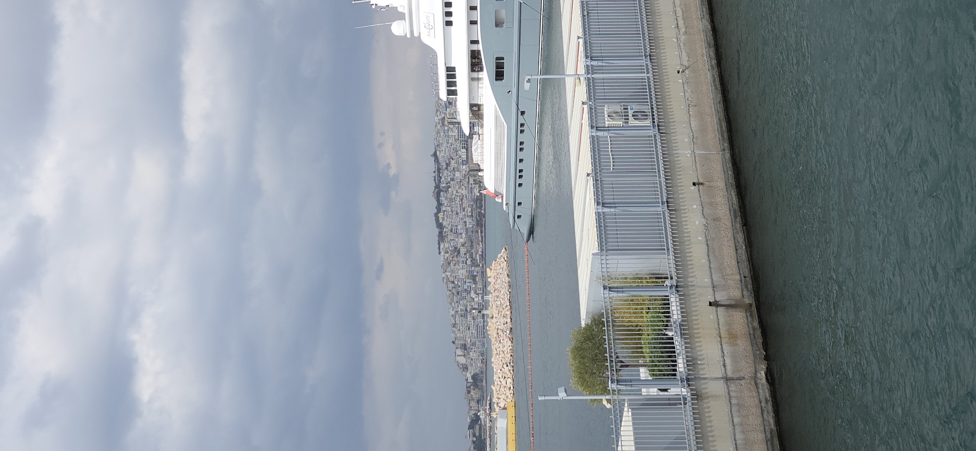 A wide-angle shot captures a marina scene in Palaio Faliro, Greece, under an overcast sky dominated by dense grey clouds. In the immediate foreground, dark blue-green water with subtle ripples is visible, bordered by a light-colored concrete quay. A grey metal fence with vertical bars and a top rail runs along the quay, behind which small green trees and light-colored, possibly industrial, structures are present. Two stacked outdoor air conditioning units are affixed to one of these structures on the right. In the midground, a large superyacht, identified partially as "RADIANT," is moored or underway towards the right, presenting its port side. The yacht features a light grey hull and a multi-deck white superstructure, displaying a red flag on its bow and a blue and white flag (likely Greek) on its stern. An orange floating line or boom extends from the yacht's bow area towards the left. To the yacht's left, a light-colored rock breakwater is present, topped by a small white and black navigational beacon or lighthouse. Behind the breakwater, a section of a large yellow marine vessel or barge is partially visible. The background reveals a densely populated urban hillside, characteristic of the city, covered with numerous white and light-colored buildings extending towards the horizon under the heavy cloud cover. No individuals are discernible in the frame. The scene is static, depicting a calm harbor environment.