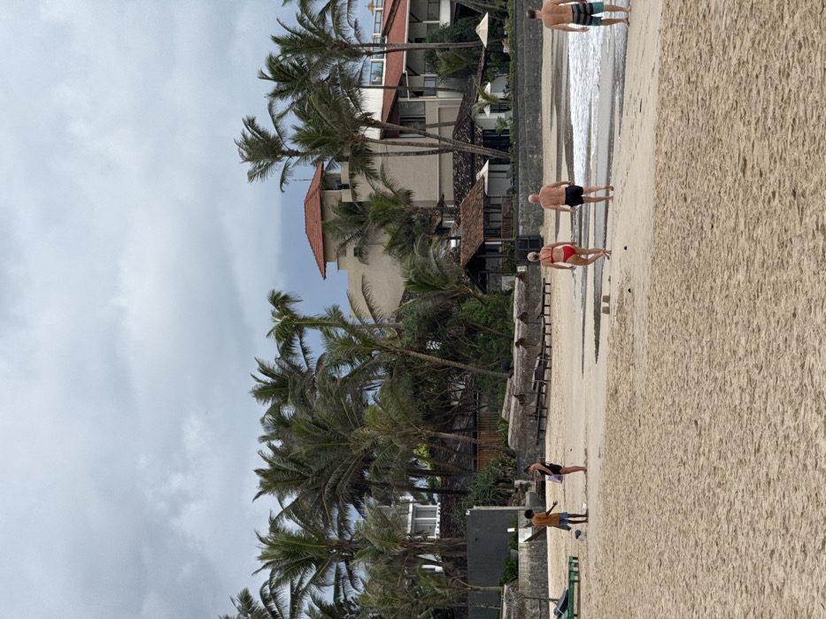 The image depicts a beach scene in Kathaluwa, Sri Lanka, under an overcast sky. The foreground features light brown sand with a wet area closer to the ocean, where small waves are breaking. On the left side of the beach, two individuals are interacting: a dark-skinned male wearing a light-colored short-sleeved shirt and dark shorts stands facing a light-skinned female in a dark top and dark bottoms. A small white object rests on the sand between them. To their immediate left, a green-cushioned lounge chair is partially visible. Further back, along a low grey concrete wall, several straw-roofed beach umbrellas/shades with associated loungers are arranged. Towards the right side of the frame, three light-skinned individuals are walking away from the camera, parallel to the waterline. The lead person is a female in a red two-piece swimsuit. Following her is a male in black swim trunks, and further to the right, another male in blue and white striped swim trunks. The background consists of a dense line of tropical vegetation, primarily numerous tall palm trees, interspersed with multiple buildings characteristic of a resort or hotel complex. These structures have reddish-brown tiled roofs and light-colored walls. One prominent building on the right features a multi-story section with balconies and a distinct tower-like element with a red tiled roof, where a person is faintly visible at an opening.