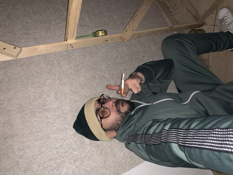 An individual is depicted indoors, reportedly in Ouislane, Morocco. A male, appearing to be in his 20s or 30s, with a full beard and mustache, is seen wearing round, dark-rimmed eyeglasses and a two-toned knitted beanie (dark green and light tan). He is dressed in a dark green tracksuit, consisting of a zippered jacket with vertical black and white striped accents on the outer sleeves, and matching pants. White sneakers with dark stripes are visible on his right foot. The individual is positioned in a crouched or squatting posture, directly facing the camera. He holds a lit cigarette between the index and middle fingers of his right hand, extended forward in a pointing gesture. The background features a textured, light-grey wall. To the right of the individual, an unfinished wooden frame structure is present, constructed from light-colored planks. A small, yellow/gold-colored object with a green string is suspended from this wooden structure. The floor, partially visible at the bottom right, appears to be light-colored.