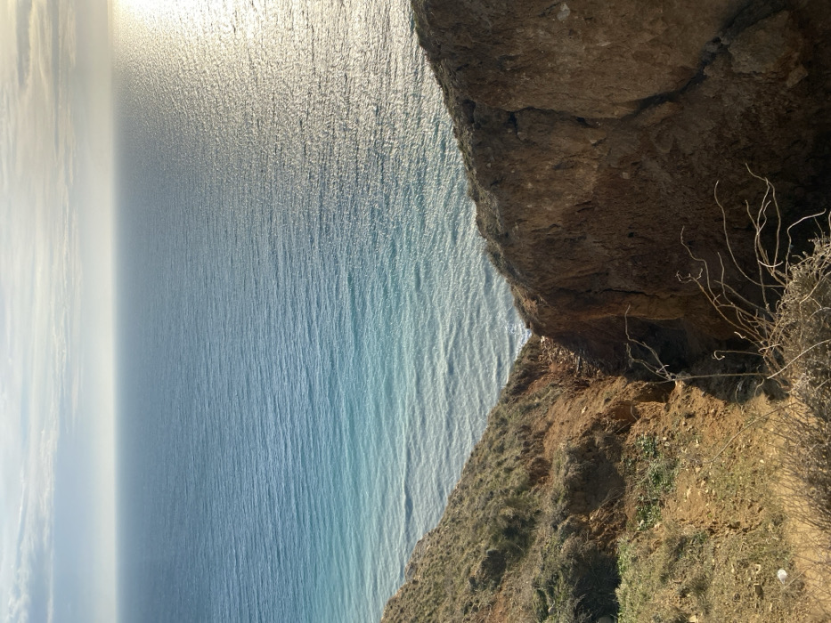 This image depicts a coastal view in Anapa, Russia, looking down from a high vantage point towards the Black Sea. In the foreground, a steep, eroded reddish-brown earth cliff face dominates the lower half of the frame. The cliff exhibits sparse patches of green and dry vegetation on its less vertical slopes, particularly on the left. A prominent, narrow gully or crevice cuts through the center of the cliff, descending towards the water. Bare, dry shrub branches are visible in the immediate lower foreground, partially obscuring the view into the gully. The midground features the calm, undulating surface of the Black Sea, which displays a gradient of color from a lighter turquoise near the base of the cliffs to a deeper blue further offshore. The sea extends horizontally to meet the sky at the horizon. Sunlight reflects brightly off the water's surface on the right side of the frame, creating a shimmering band of light across the ripples. The background consists of a light blue sky with wispy, scattered white clouds, appearing hazier near the horizon. No people, animals, or man-made structures are visible within the scene.