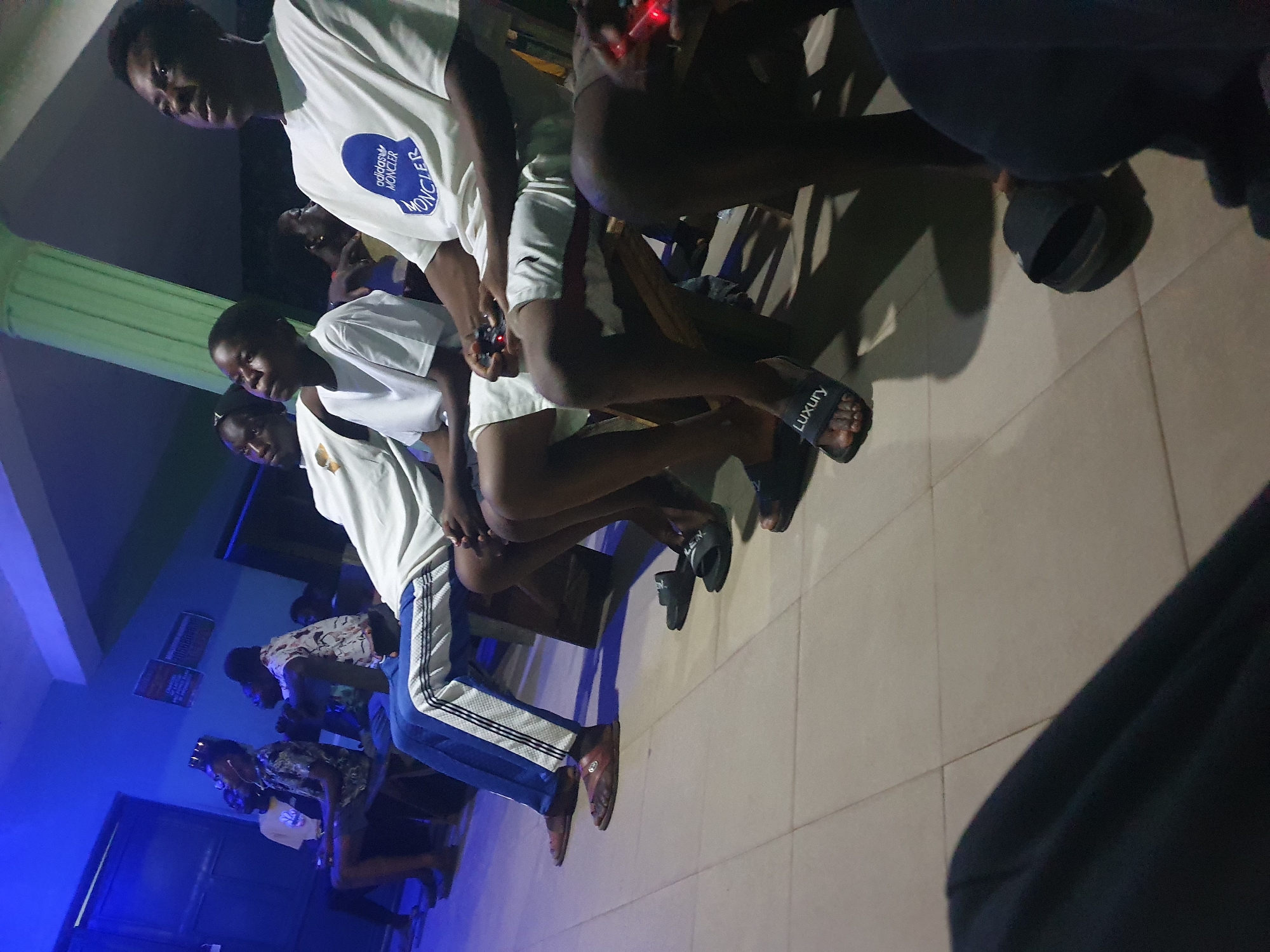 An indoor scene in Lokoja, Nigeria, depicts approximately seven young males seated on wooden benches or chairs, facing forward and looking slightly upwards. The environment is illuminated by a prominent blue ambient light emanating from the ceiling area on the left, casting a cool tone over the upper part of the room, while the lower half and foreground remain darker. The floor is composed of light-colored square tiles. A white pillar is visible on the right side of the frame, and a dark door or wall is present on the far left. The individuals are dressed in casual attire. One male in the foreground, right of center, wears a white t-shirt featuring a blue "Adidas Moncler" logo and white shorts, holding a dark video game controller. Another person partially visible on the far right also holds a controller, which emits a red glow. A male to the left of the "Adidas Moncler" shirt wearer wears a white t-shirt and dark shorts, with "Luxury" branded slide slippers on his feet. Further to the left, another male wears blue track pants with white stripes, paired with brown slide sandals. The individuals appear focused on an activity or screen not visible within the frame, suggesting a gaming or viewing session.
