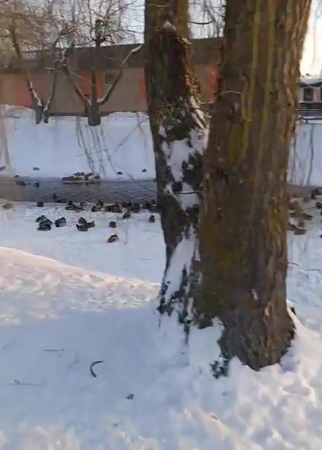 - "snowy park scene with a small, shallow stream filled with a large flock of ducks" by FM-fpfCx2, licensed under CC BY 4.0