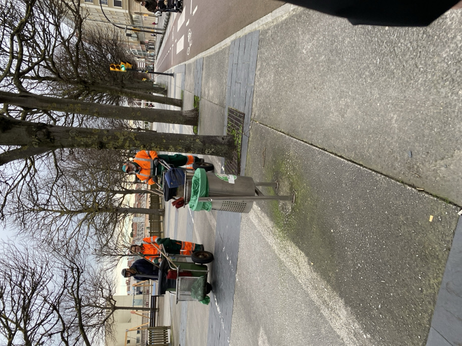 The image displays an urban scene in Gijón, Spain, specifically a wide pedestrian promenade alongside a multi-lane street, likely a central avenue such as Avenida de la Costa. The environment features a row of leafless deciduous trees lining the left side of a grey concrete promenade. In the foreground, a stainless steel public waste bin containing a green plastic liner is situated on the concrete. The ground shows patches of moss and scattered cigarette butts. Three individuals, identified as municipal sanitation workers, are visible on the promenade. All three wear high-visibility orange and green uniforms. The leftmost worker is a male in a dark cap, wearing a blue jacket over his uniform, pushing a two-wheeled service cart equipped with a front mesh basket containing green debris and a large black bag. The middle worker is a female, pushing a similar cart containing a black bag and tools; she appears to be looking towards the first worker. The rightmost worker is an older male with a beard and a cap, pushing his own two-wheeled cart which holds a blue object, a brush, and a black bag. They are moving from left to right across the scene. To the left, in the background, a children's playground with wooden fencing and structures is partially visible. To the right of the promenade, a distinct red asphalt bicycle lane runs parallel to a darker asphalt road. A green traffic light is active above the road. Multi-story urban buildings line the far side of the street. A fourth individual is observed in the distance on the bike lane, pushing a baby stroller. The sky is overcast, providing diffused light across the scene.
