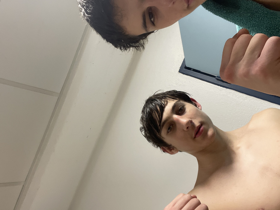 Two shirtless young men are angled downward toward the camera. Both have wet, dark hair. The individual at the bottom of the frame displays a portion of bare chest and shoulders. A blue-framed mirror and a green towel partially obscure the head of the person at the top. They appear to be standing indoors against a white wall.