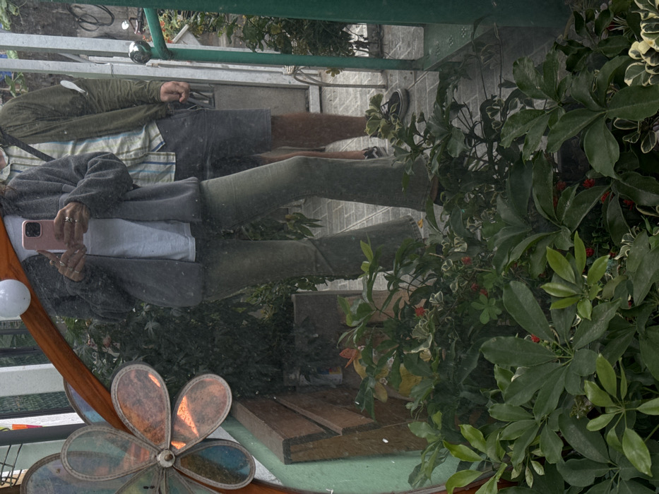 The image displays a mirror reflection of two individuals within an outdoor or semi-outdoor setting in Ngũ Hành Sơn Ward, Vietnam. In the foreground, the lower portion of the mirror is covered by numerous dense green plants, some exhibiting red berries or reddish foliage. A woman, positioned centrally, is reflected holding a light pink smartphone in her right hand, capturing the image. She wears a grey zip-up hoodie over a white t-shirt and olive-green flared pants; rings are visible on multiple fingers of her left hand. To her immediate right, a man is partially reflected, wearing a plaid shirt under a dark olive-green jacket, dark shorts, and black and white sneakers. A dark shoulder strap crosses his chest. The mirror features an ornate frame on the left side, decorated with a multi-petaled, translucent flower-like element in shades of orange and blue, and a white spherical accent at the top left. The reflected background includes paved ground, a wooden structure or bench on the left, and a green metal railing on the far right.