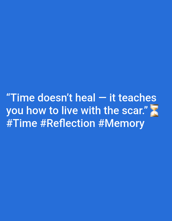 The image displays white text centrally aligned against a solid royal blue background. The primary text reads, "Time doesn't heal — it teaches you how to live with the scar." A sand-timer emoji (⏳) is positioned at the end of this statement. Below this quote, the hashtags "#Time #Reflection #Memory" are rendered in white text. There are no people, discernible subjects beyond the text and emoji, or specific actions depicted. The environment is a two-dimensional digital graphic. This image does not depict a physical location within 김포시, South Korea, or any other geographical area.