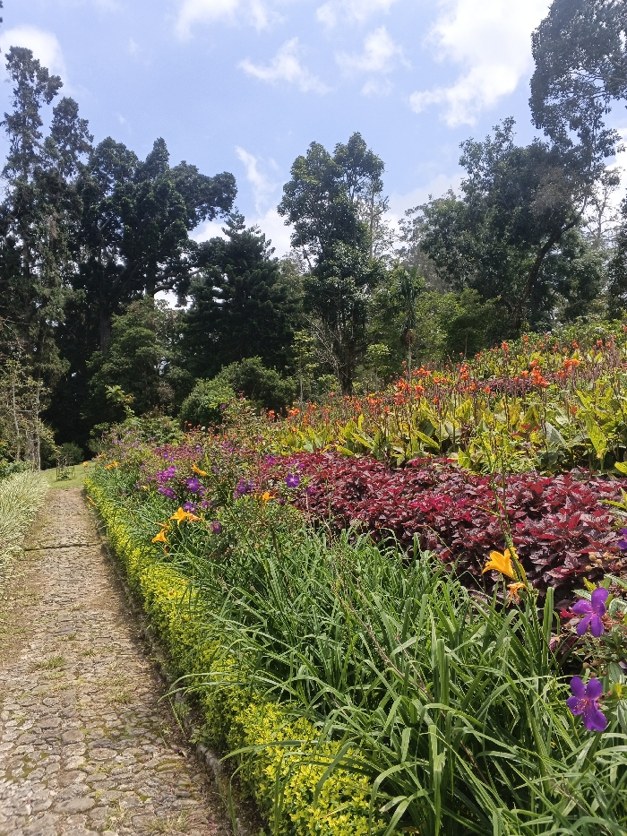 A stone path winds through a lush garden landscape. Vibrant flowers in shades of orange, purple, and red cascade down a hillside. Green foliage and tall trees rise in the background against a partly cloudy sky. A trimmed hedge lines the path, offering a defined edge between the walkway and the colorful floral display. The scene conveys a sense of tranquility and natural beauty.