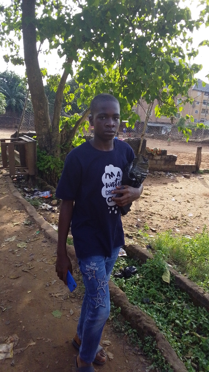 An image captured in Obosi, Nigeria, depicts a young male standing outdoors on an unpaved, reddish-brown dirt path