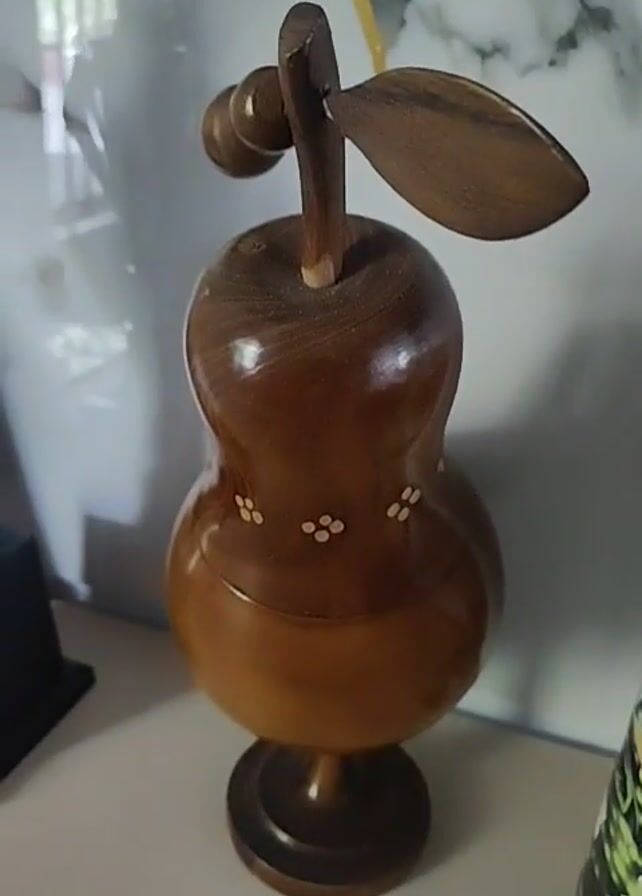 A wooden pear-shaped object with a base is shown in close-up. The object has a leaf and a stem with a small ball on it. There are small white flower-shaped decorations on the body of the pear. The object is sitting on a white surface.