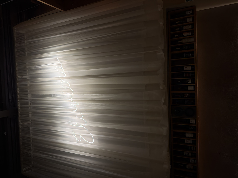 A dimly lit interior presents a striking contrast. A sheer white curtain spans the width of the image, illuminated by a vertical neon sign with cursive script. Beside the curtain, a tall, narrow wooden rack is filled with bottles. The background remains mostly obscured by darkness, with a hint of a wall on the right and a dark doorway on the left, emphasizing the illuminated curtain and the wine rack.