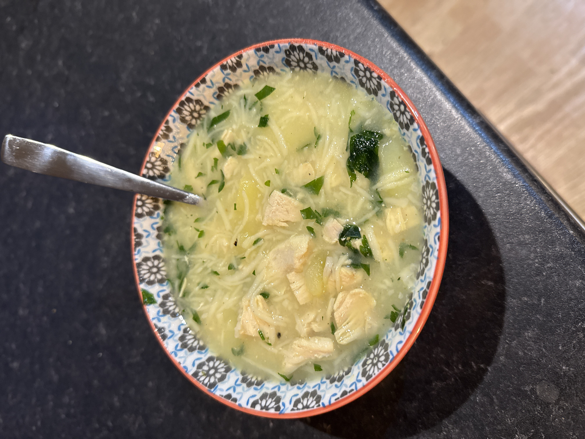 A bowl of chicken noodle soup sits on a dark countertop. The bowl has a colorful pattern around the rim with shades of orange, blue, and floral designs. A silver spoon rests inside the bowl, partially submerged in the soup. The soup contains chicken pieces, noodles, potatoes and what appears to be chopped greens. The countertop is dark and speckled. The location is unknown, and there is no evidence to indicate Great Yarmouth, United Kingdom.