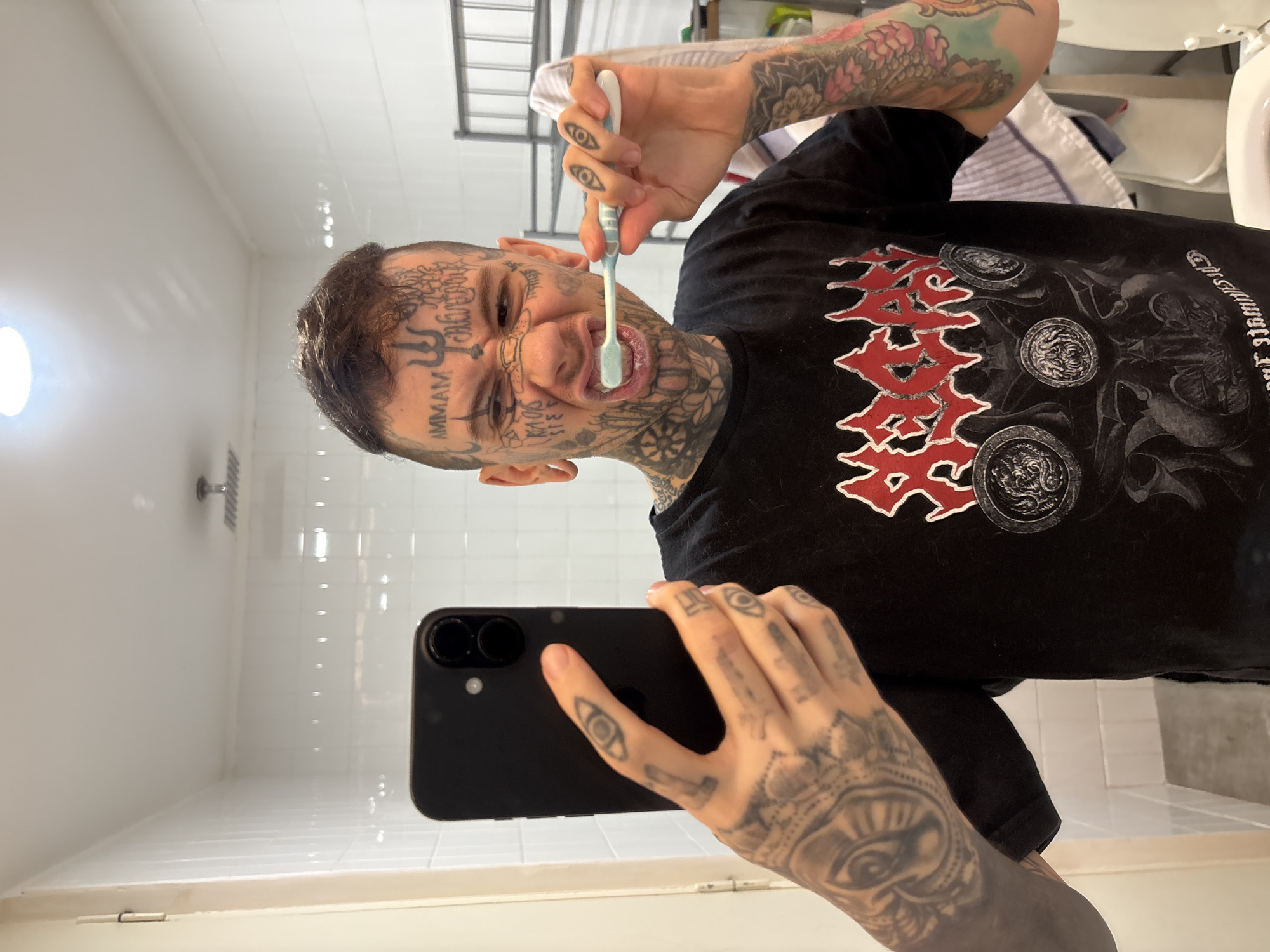 The scene depicts a heavily tattooed individual taking a mirror selfie in a bathroom. The person, an adult, holds a black smartphone in their left hand, capturing their reflection. They are simultaneously brushing their teeth with a light blue and white toothbrush held in their right hand, while grimacing slightly. Their face, neck, hands, and arms are extensively covered in tattoos, including symbolic designs and text on the face (e.g., "AMMAM", a trident symbol, "KAOS"), and eye symbols on the fingers. The individual wears a black t-shirt featuring a red, jagged "SLAYER" (or similar band) logo and circular skull motifs. The background reflects a typical bathroom environment, characterized by white tiled walls, a white ceiling with a single overhead light fixture, a partially visible white door frame on the left, and a metal shelving unit with a striped towel above a white toilet with an open lid on the right. No specific identifiers are present to ascertain a precise location within the city of Buenos Aires, Argentina.