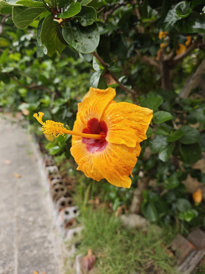An outdoor scene in Nha Trang, Vietnam, depicts a vibrant orange hibiscus flower in sharp focus, positioned slightly right of the frame's vertical center. The flower presents five textured petals, predominantly orange with a deep reddish-pink to purple center, and appears to have small water droplets on its surfaces. A prominent red pistil, topped with a textured, bright yellow, multi-lobed stigma, extends outward from the flower's core. The background, largely blurred, consists of dense green foliage and branches from a bush or tree, likely the host plant. To the left, a light grey concrete pathway runs vertically, bordered by a low structure composed of stacked, reddish-brown hollow bricks. A patch of green grass with scattered brown leaves occupies the lower right portion of the scene. No individuals, specific actions, or interactions are present. The environment appears natural and well-lit, possibly under overcast conditions.