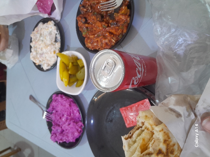 The image depicts a dining scene set on a light blue-grey table in Deir el-Balah, Palestinian Territory. In the foreground, a partially consumed flatbread sandwich, wrapped in white paper, rests beside two small red condiment sachets. A red Coca-Cola can with a silver top is centrally positioned. Surrounding these items are multiple dishes: a black plate containing a vibrant purple shredded salad, with a silver fork resting on its edge; a small white square bowl filled with green pickled gherkins and yellow pickled peppers; a black plate holding a creamy white salad; and another black plate containing a reddish-brown stew, in which a silver fork is partially visible. An additional empty black plate is present. A transparent plastic bag is crumpled on the table surface. In the upper right background, a person's hand is partially visible, appearing to hold white paper. A "Galaxy A14" watermark is located in the bottom left corner.