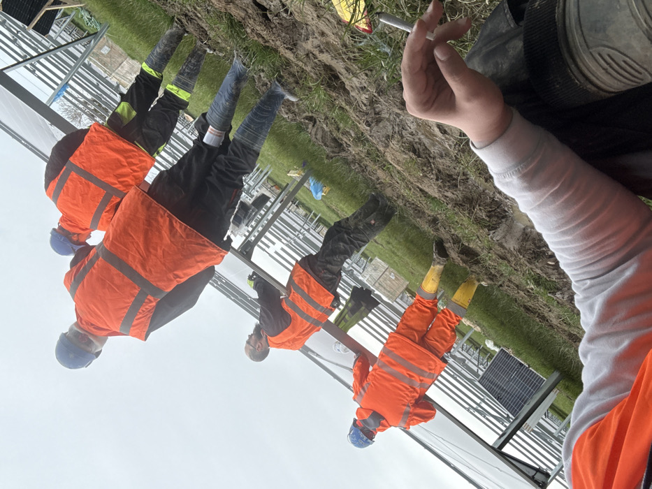 The image portrays an outdoor solar farm construction site in Baldurgen, Ireland, under an overcast sky. The ground consists of disturbed earth, mud, and patches of grass. Four individuals are present, all attired in personal protective equipment. This includes blue hard hats, orange high-visibility vests or jackets (one worker on the far left wears an orange high-visibility suit), dark work trousers, and rubber work boots (blue, black, and yellow). Three individuals are positioned further from the camera, facing generally away, actively engaged with or standing near partially installed solar panel arrays mounted on metal racking structures. The worker furthest left appears to be handling or installing a solar panel. In the immediate foreground, the right hand and forearm of a fourth individual are visible. This individual holds a lit cigarette between their fingers. A portion of their light grey long-sleeve shirt and an orange high-visibility vest are also visible.