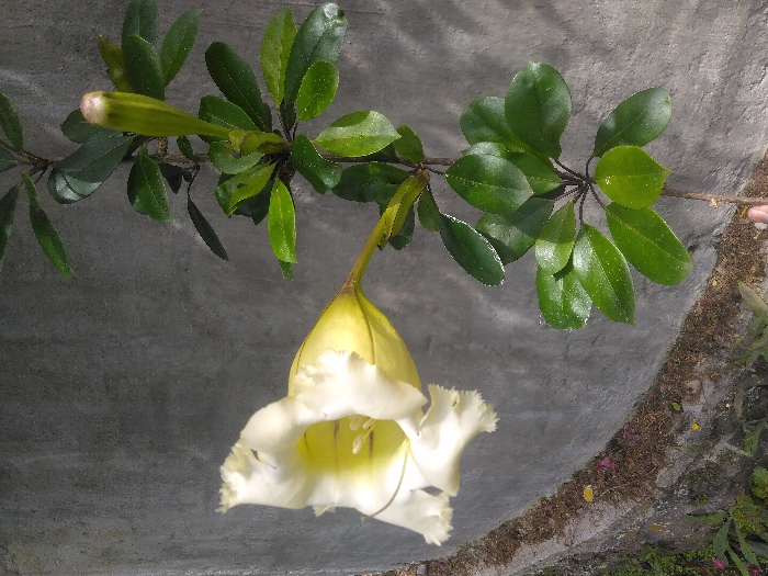 The image displays a close-up, vertical composition of a plant with a large, light yellow-cream colored flower and an unopened bud, positioned against a plain, grey concrete wall. The flower, centrally located on the left side, is bell-shaped with ruffled edges and exhibits a deeper yellow interior. To its right, a green stem with numerous oval, glossy dark green leaves extends vertically, with a distinct, elongated green flower bud pointing upwards near the top right. The base of the concrete wall is visible in the lower left, where it meets a strip of dark soil and sparse green vegetation, including some small purple and yellow specks, possibly fallen petals. The scene is illuminated by natural light, casting subtle shadows on the wall. This outdoor scene is located in Cipanas, Indonesia.