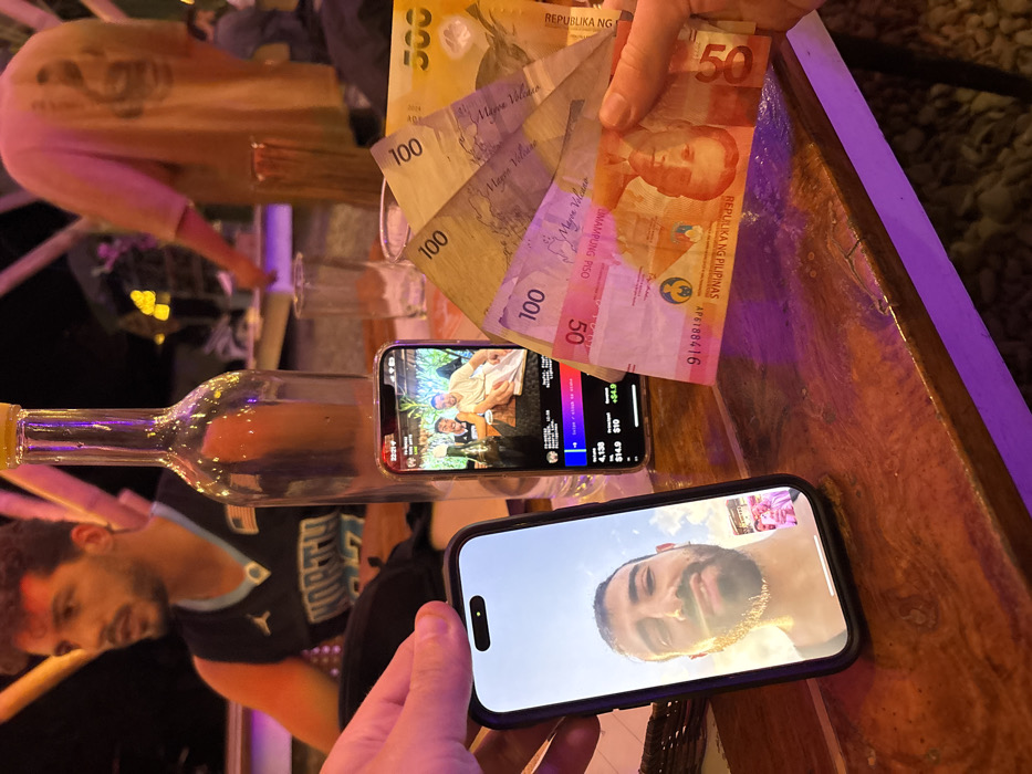The image depicts a nighttime scene at an outdoor or semi-outdoor establishment in General Luna, Philippines, characterized by ambient purple lighting and background bamboo structures. A wooden table serves as the primary surface in the foreground. On the left, a person's hands hold an iPhone 14 Pro/Pro Max vertically, displaying an active video call. The screen shows a bearded male's face, making a slight grimace, with a bright outdoor background behind him, and a small inset video window in the bottom right corner showing a female. Centered on the table, a second iPhone, in a clear case, stands upright. Its screen displays a video or live stream featuring two males seated at a table outdoors. Below the video, text indicates "General Luna, Siargao" and various numerical values including "$14.9", "$10", and "+$4.9", suggesting a financial or streaming application interface. To the right of the upright phone, another person's hand holds a fanned stack of Philippine Peso banknotes. Visible denominations include 50, 100, and 500 peso bills. In the middle ground, an empty, clear glass bottle with a yellow cap and two empty clear drinking glasses are present on the table. Behind these objects, a male with dark, curly hair and a beard is seated, wearing a black and light blue sleeveless jersey with "NORTH" visible on the front. He is looking off to the left side of the frame. In the blurry background, a person in a light brown oversized t-shirt is partially visible, standing on the right. Warm yellow lights are discernable in the distant background.