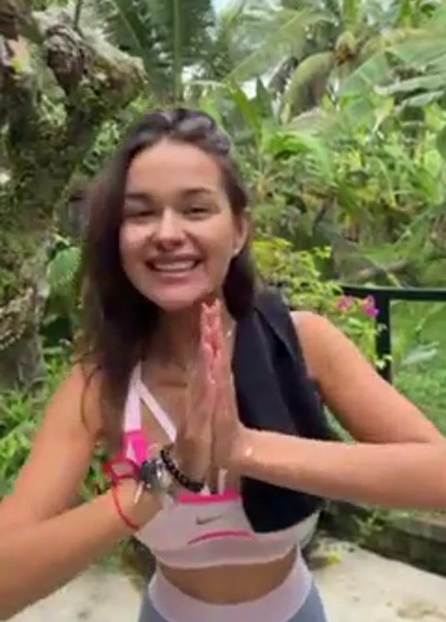 A young woman wearing a light pink sports bra and tight, light gray shorts with a towel draped over her shoulder stands in a lush, green outdoor setting. She is smiling and looking directly at the camera with her arms outstretched. She blows a kiss to the camera and then forms a heart shape with her hands. Behind her is a variety of tropical plants and trees, and a stone balustrade is visible in the background.