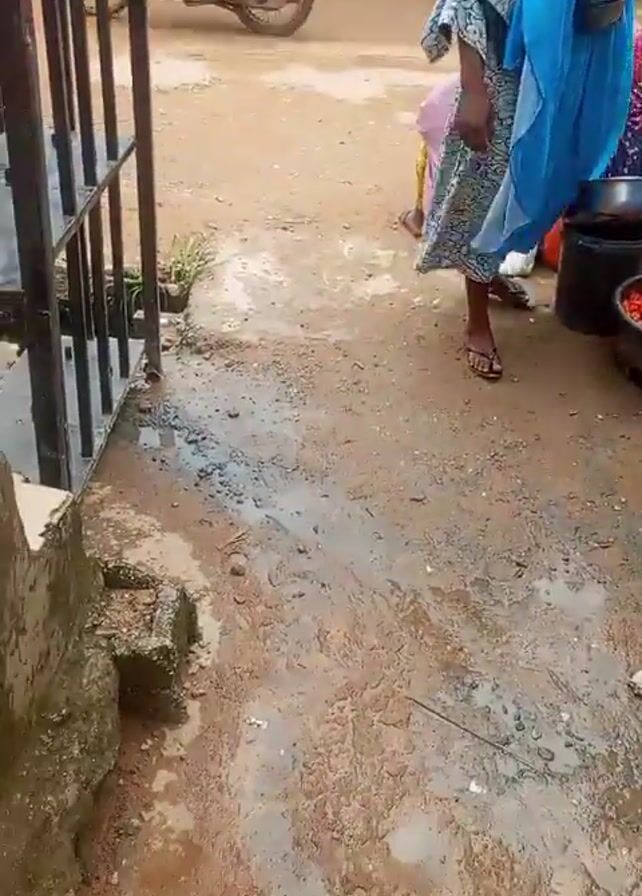 The scene captures an outdoor marketplace or street in what appears to be a developing country, evidenced by the modest storefronts and the state of the ground. The ground is partially covered with dirt and puddles, suggesting recent rain. Several individuals are present, including a woman wearing a blue hijab and patterned dress, who is carrying a baby in a sling. Another woman in a white shirt and dark pants walks by holding what seems to be currency. In the background, another woman is seated on the ground wearing a pink headscarf and dress. Various items are on display, including vegetables in tubs and stacked goods behind a storefront. There's a motorcycle passing behind them, and a fenced area is visible on the left side of the frame. The atmosphere seems to be that of a typical bustling local market.