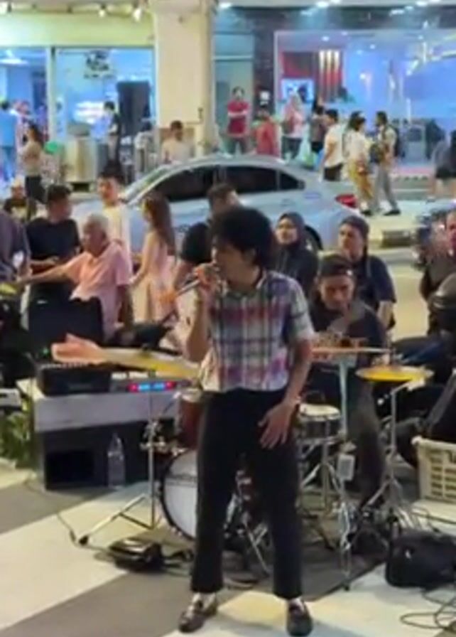 A street musician and his band are performing in front of a crowd of onlookers. The musician, who has dark curly hair, is wearing a plaid shirt, dark pants, and shiny black shoes. He is holding a microphone and singing. Behind him is a keyboard, a drum set, and other musical equipment. The band members are playing their instruments. The crowd is a mix of men and women of various ages. Some people are watching the performance intently, while others are talking to each other or looking at their phones. Cars pass in the background. The performance is taking place on a paved area in front of a storefront called "Paradise." The sky is dark, suggesting it is evening.