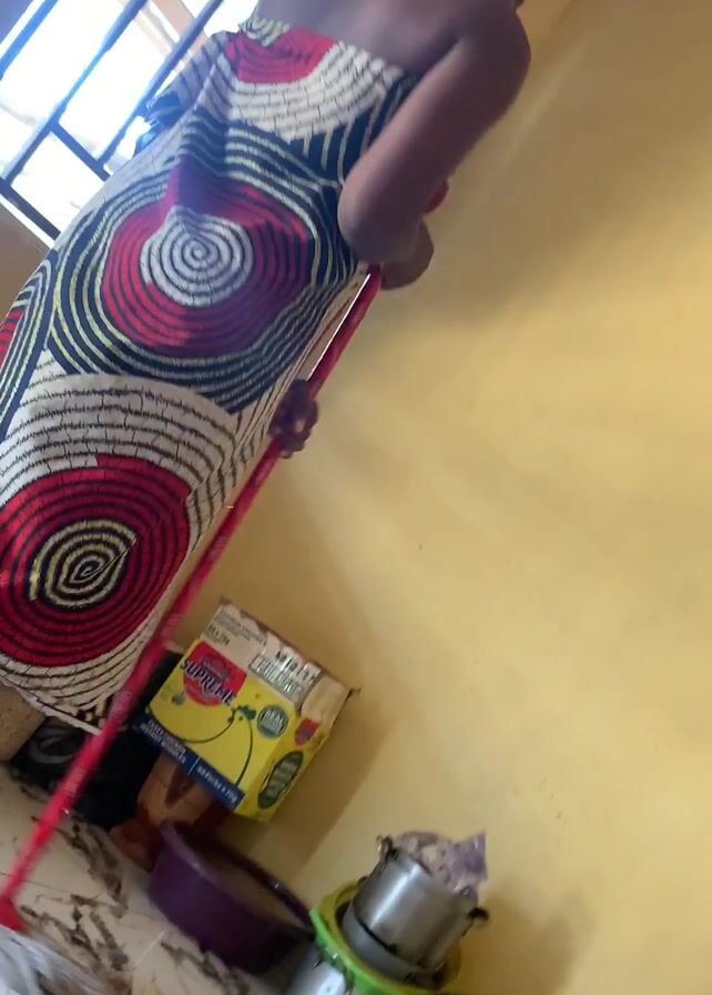 A woman in a colorful dress opens a window in a yellow room. The room contains a bed, pots, and bags. The camera angle is low.