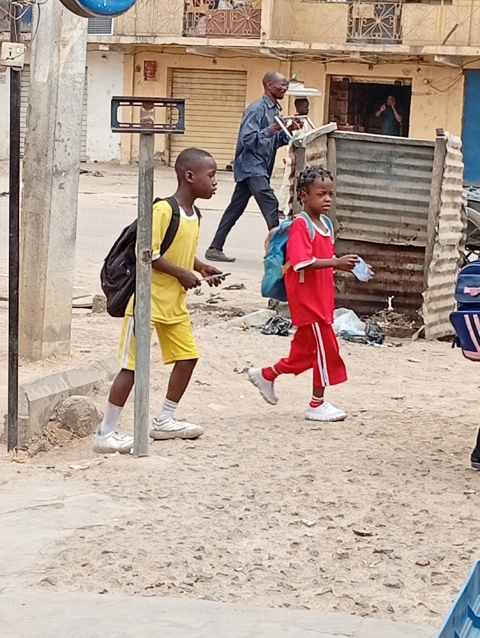 An outdoor urban street scene in Sabon Gari West, Nigeria. In the foreground, two children walk leftward on an unpaved dirt path. A young male child on the left wears a yellow t-shirt, yellow shorts, white socks, and white sneakers, carrying a black backpack and holding a white smartphone. A young female child on the right wears a red t-shirt, red pants with white stripes, white socks, and white sneakers, carrying a light blue backpack and holding a light blue disposable face mask. A grey metal pole with an empty rectangular frame stands in the immediate foreground. In the mid-ground, an older adult male, dressed in a dark blue striped long-sleeve shirt, dark pants, and dark shoes, walks rightward. He balances a stack of white trays on his head and holds a metal tray rack in his hands. Another individual is partially visible behind him, also carrying an item on their head. The background consists of two-story buildings with light-colored, worn facades. Some ground-level shop entrances are visible, one with a person standing inside a doorway on the far right. Several shopfronts display rolled-down corrugated metal shutters, and upper-story windows feature decorative metal grilles. Debris, including plastic bags, is scattered on the ground near a corrugated metal structure on the right side of the frame.