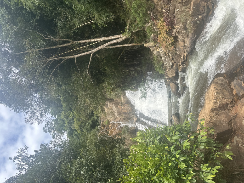 A sideways view shows a waterfall cascading down a rocky slope, framed by lush green trees and vegetation. Water flows over the rocks, creating whitewater rapids. A slender tree with light-colored branches stretches across the top left, adding to the natural scenery. The sky appears partly cloudy in the background.