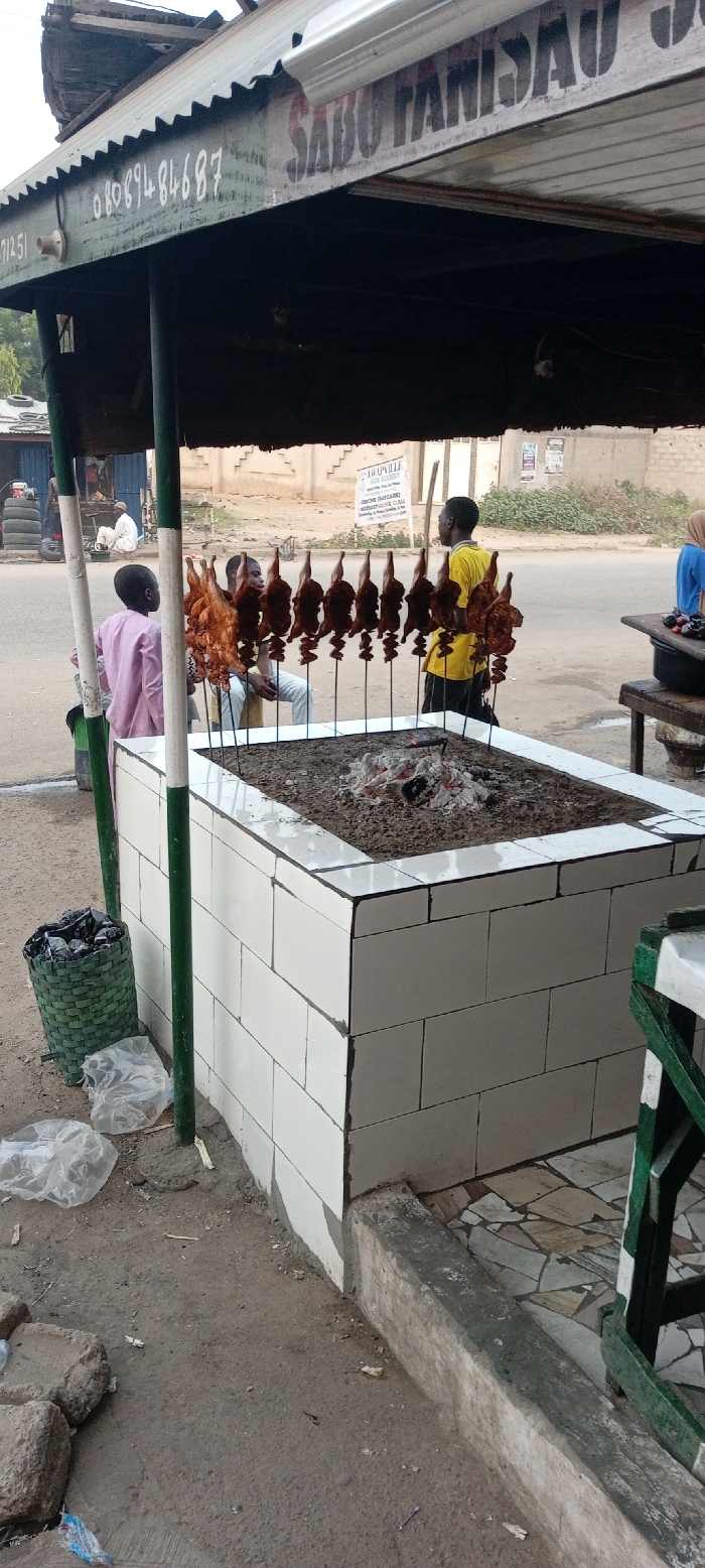 - "A roadside food stall displays skewered chickens grilling over a charcoal fire in a white-tiled pit" by FM-oATT32, licensed under CC BY 4.0