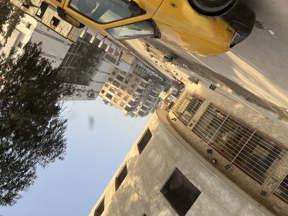 A tilted perspective captures an urban scene, dominated by a yellow vehicle in the upper portion. Buildings in various states of construction line a street, some with scaffolding and incomplete facades. A tree with dense foliage is visible on the left. The lower portion of the image shows a building with exposed window openings and a facade with barred windows. The overall composition evokes a sense of urban development and everyday city life.