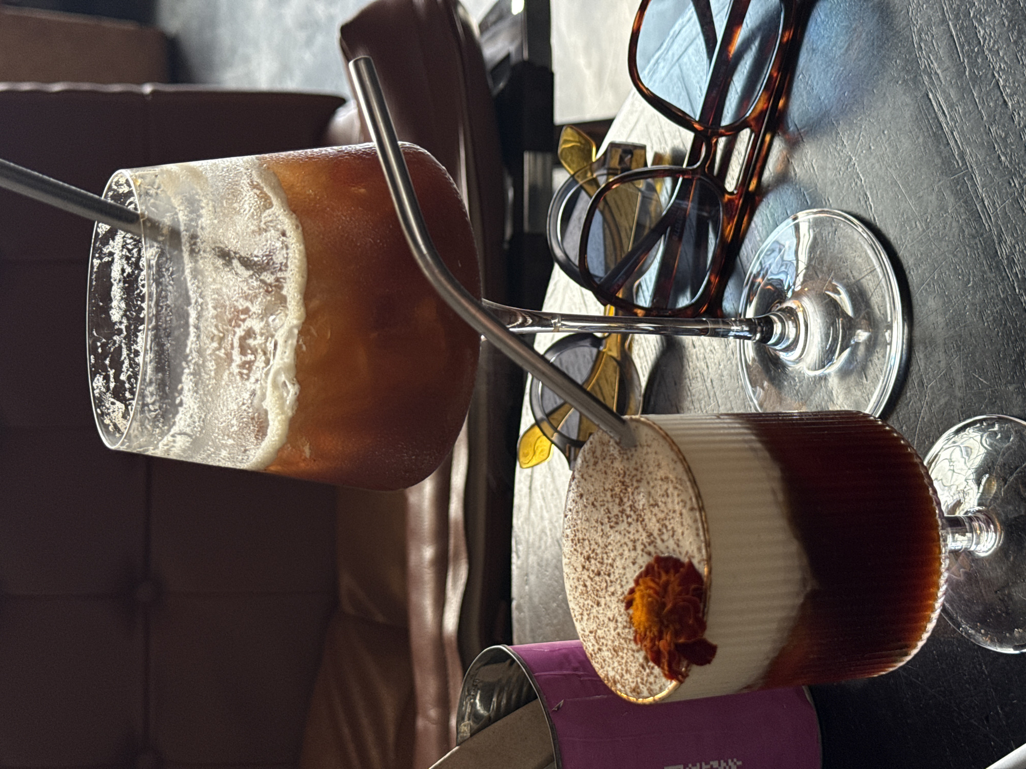 two cocktails on a dark table, with a pair of glasses, a chair, and a can. One cocktail is in a tall glass with a light-colored head and a metal straw. The other cocktail has distinct layers of white and brown, topped with a small orange flower, and is sitting on top of a purple can. The glasses have clear stems and bases. The environment appears to be a cafe or bar, and it seems to be located in North Kuta, Indonesia.