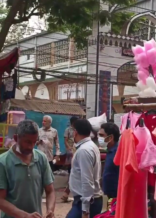 The video depicts a bustling street market scene with several vendors and pedestrians. In the initial shot, there's a cart with pink and white cotton candy, as well as a display of children's clothing. In the background, there's a mosque. The camera then pans, revealing more market stalls covered by makeshift awnings selling clothing and fabric. People are browsing, walking, and interacting with the vendors. Some individuals are wearing masks. The overall environment is crowded and appears to be a typical outdoor marketplace.