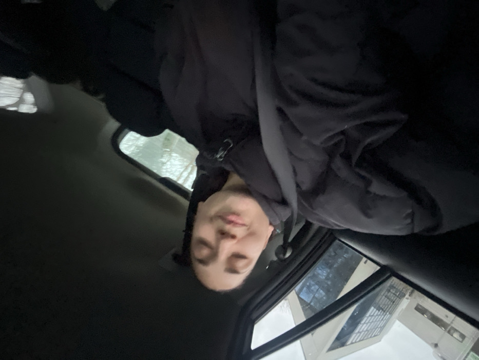 The image depicts a single female individual seated inside a vehicle, located in Geispolsheim, France. The subject is wearing a dark, possibly black, puffer jacket and is secured by a seatbelt visible across her chest and left shoulder. Her eyes are closed, and her lips form a slight upturned curve. The vehicle's interior is dark. Through the left-side window, a modern building with a distinctive light-colored, possibly white, facade, featuring a prominent triangular or peaked roofline and large glass panels, is visible. The exterior environment, seen through the vehicle's windows, suggests an overcast sky, with bare tree branches discernible through the upper right window area. No other individuals are present, and no specific actions or interactions are depicted beyond the subject's posture within the vehicle.