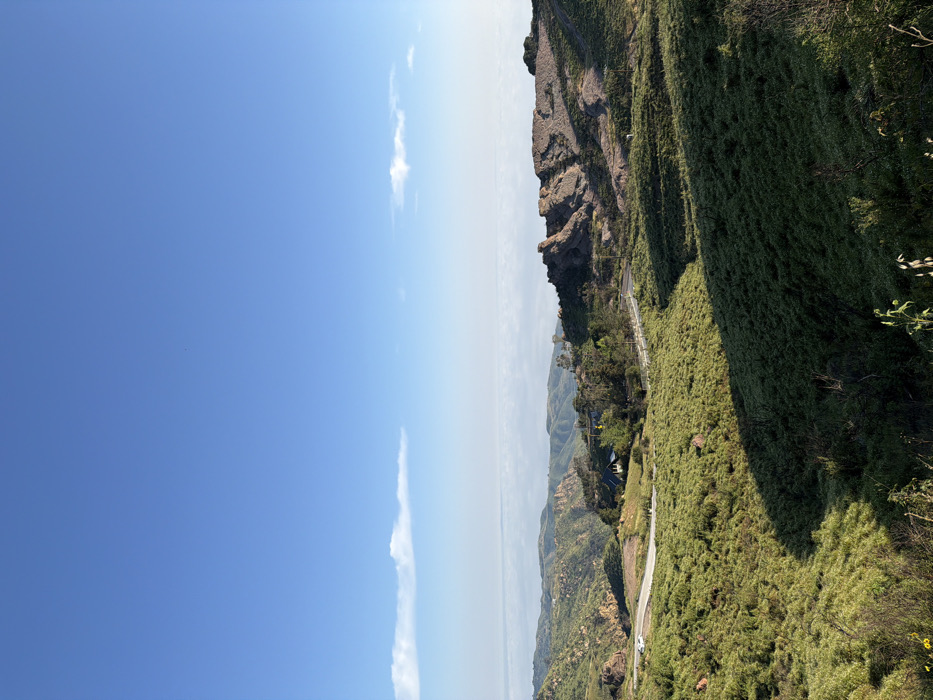 The image depicts a vast, sunlit mountainous landscape in the Unincorporated Santa Monica Mountains, United States of America. The upper third of the frame shows a clear, bright blue sky with two narrow, horizontally elongated white clouds near the distant horizon. Below the clouds, a broad, uniform layer of hazy white or light grey covers the far-off terrain, suggesting an atmospheric inversion layer or marine layer. The midground is dominated by rolling hills and valleys covered in light green and darker green vegetation, primarily low-lying brush and grasses. Distinct shadows are cast across the slopes from sunlight originating from the upper left. A dark grey asphalt road winds through the scene, curving from the left side of the frame towards the center-right. A white passenger vehicle is visible on the road on the left. Near the center-left, nestled within a cluster of trees, a white residential structure with a dark roof is partially visible, featuring identifiable windows. Several utility poles with overhead lines are positioned near the road and the structure. To the right of the road, a large, rugged rock formation, exhibiting shades of brown and grey, rises from the landscape, casting its own shadows. A small, indistinct white object is located on a grassy slope below this rock formation. The foreground consists of steeply sloped hills covered in similar green vegetation, with some taller, sparse plant stalks visible at the bottom edge. No individuals or explicit interactions are discernible within the scene.