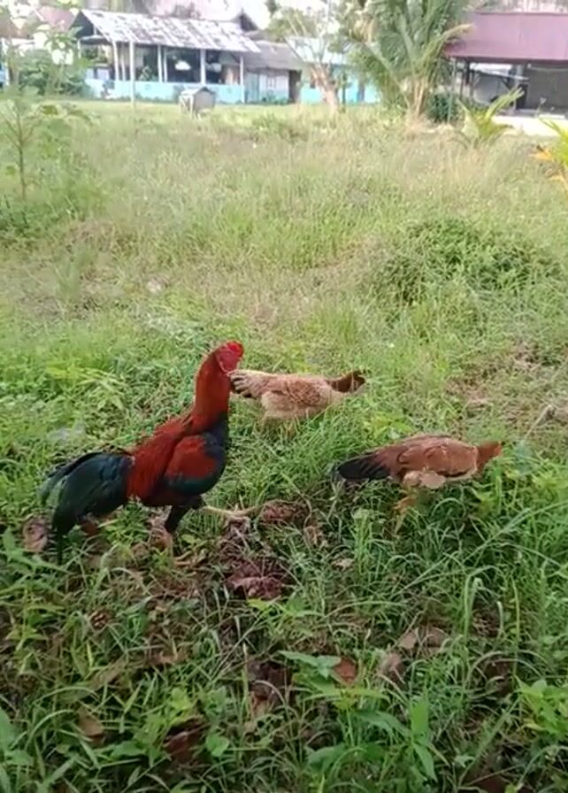 grassy area with several chickens roaming freely. A rooster with red and black plumage is the most prominent chicken, standing near a patch of green foliage on the right side of the frame. Two smaller, lighter-colored chickens are visible nearby. In the background, a house with a grey roof can be seen partially obscured by vegetation. The camera is held in a vertical orientation, and the shot appears to be taken outdoors.