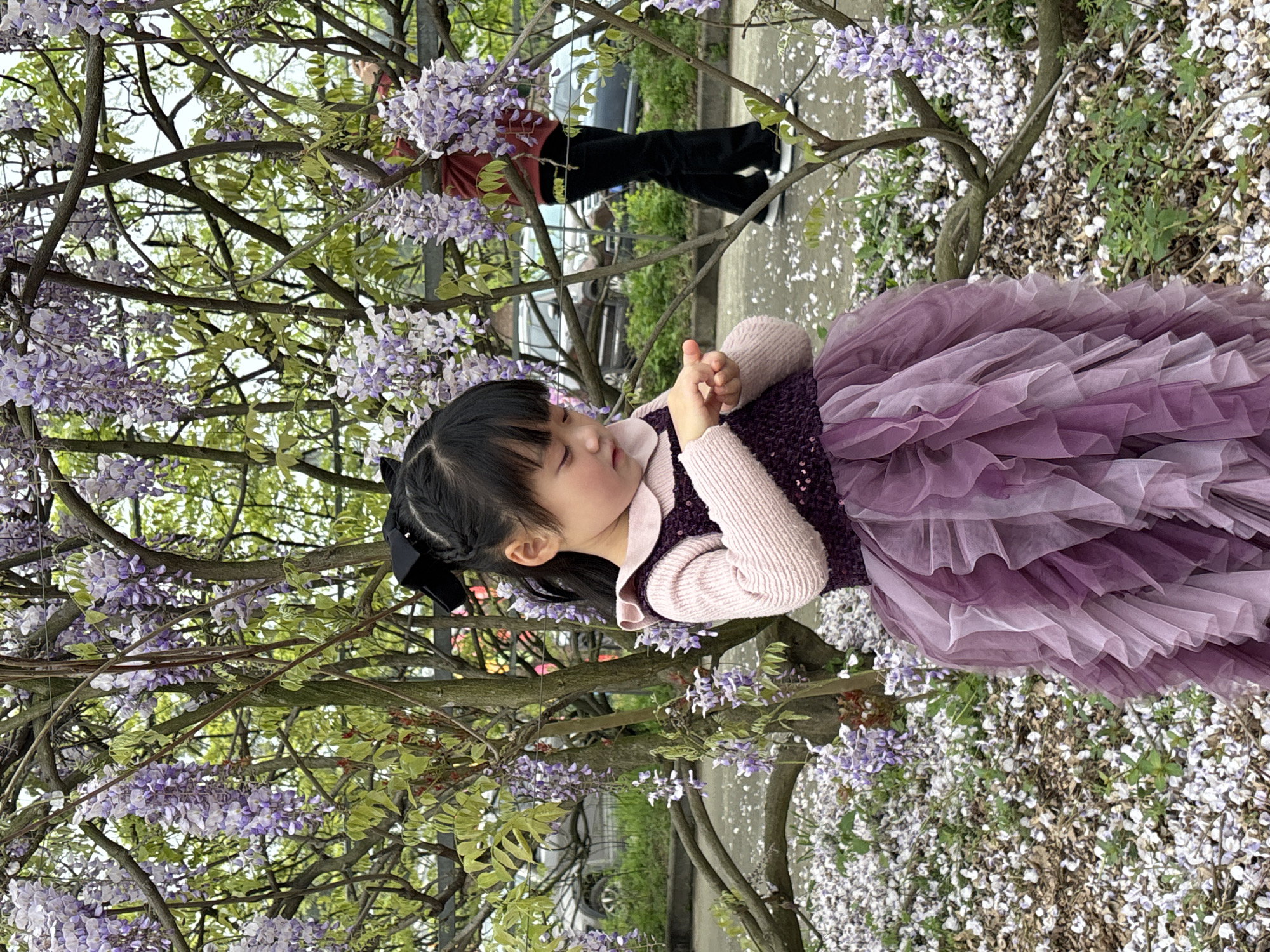 A young girl with black hair, wearing a purple dress and pink sweater, stands amid wisteria blooms and fallen petals. She has a black bow in her hair and is facing right with her hands clasped. An adult with a red shirt and black pants walks on the path behind her. The surroundings consist of trees, blooming wisteria, fallen petals, and some greenery. A car and buildings are visible in the background. The location is Xianfeng, China.