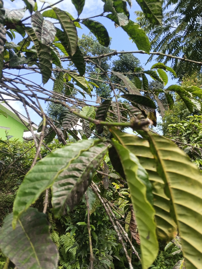 A close-up view shows coffee tree branches laden with elongated, green leaves displaying prominent veins. Some leaves exhibit dark, necrotic patches. The branches are slender and bare in sections. The background reveals a canopy of taller trees with blue sky visible in gaps. A green structure, possibly a building, is glimpsed on the left. Undergrowth of ferns and other plants fills the lower portion of the image.