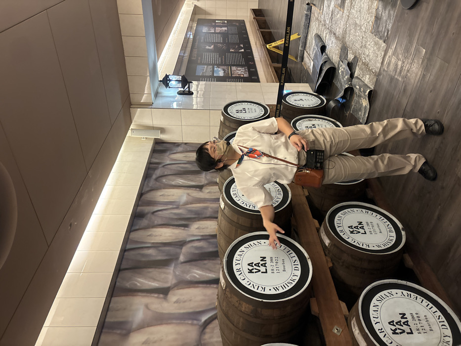 The image depicts an indoor scene at the Kavalan Whisky Distillery in Yuanshan, Taiwan