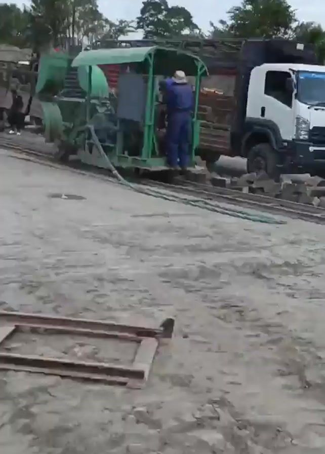 work site where rectangular concrete blocks are being laid down on a construction site. A green machine moves forward along the partially constructed line of blocks, as a person stands on the machine. Next to the machine, a white truck is loaded with concrete blocks. Several men are walking around and interacting with the construction process. The ground is dusty and gray. In the foreground, an object is lying on the ground. The sky is cloudy.
