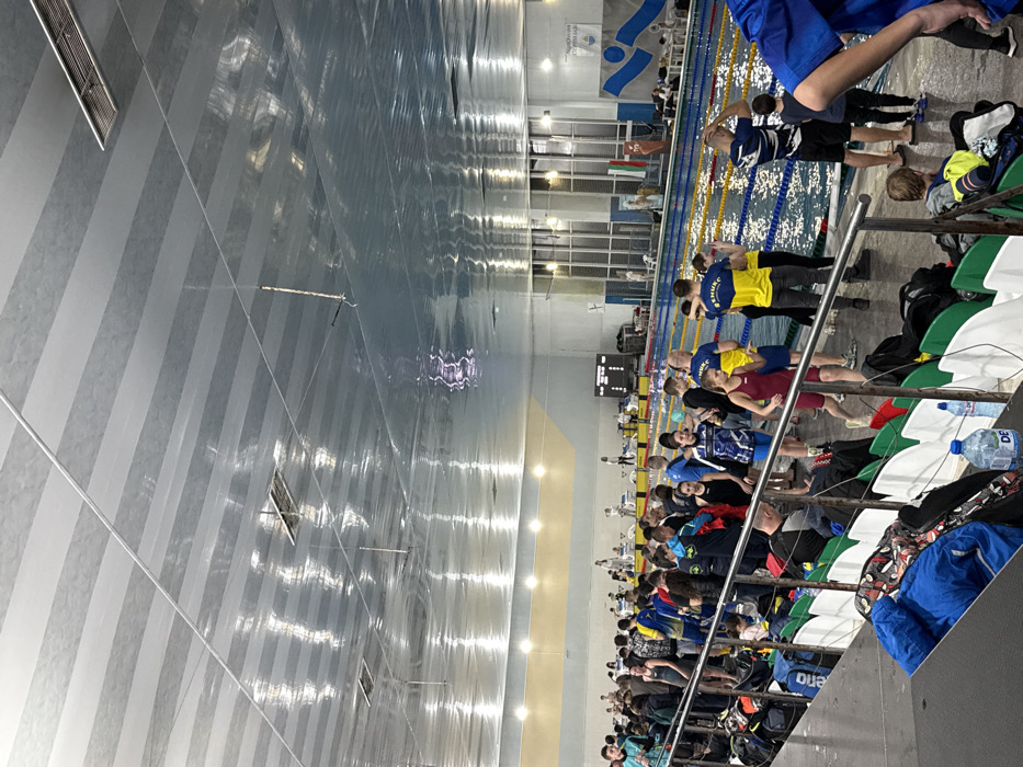 The image captures an interior view of an indoor swimming complex, identified as the National Sports Base - Swimming Complex "Sportna Sofia ZONA 5" in Sofia, Bulgaria