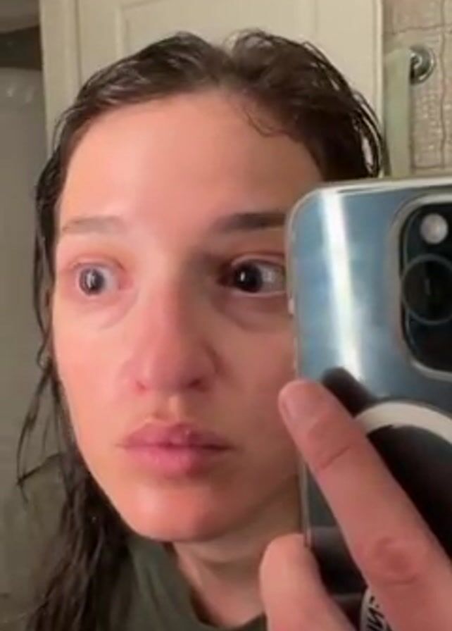 A woman with wet dark hair stands in a bathroom holding a silver iPhone in her right hand, pointed at herself