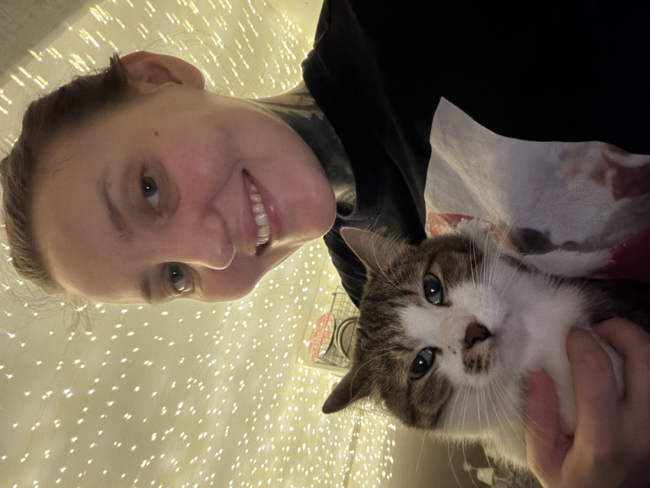 A selfie shows a smiling person holding a cat. The person has fair skin, light brown hair pulled back, and a tattoo on their neck. The cat has white and brown fur, blue eyes, and is looking at the camera. A blurry background features string lights creating a warm, soft glow.