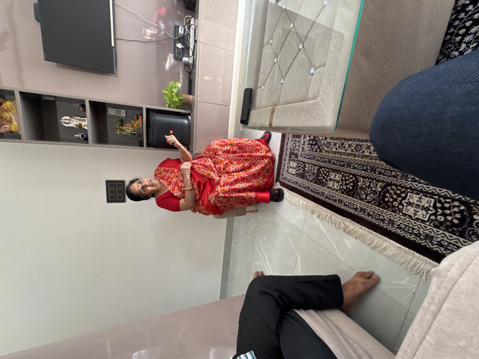 An elderly woman in a red sari sits on a beige tile floor near a low coffee table with a glass top. Behind her is a gray wall with a television and shelving unit. An area rug with a dark brown and beige pattern lies between the woman and a person wearing dark pants who is seated on a beige couch. The angle suggests the photo was taken from a seated position.