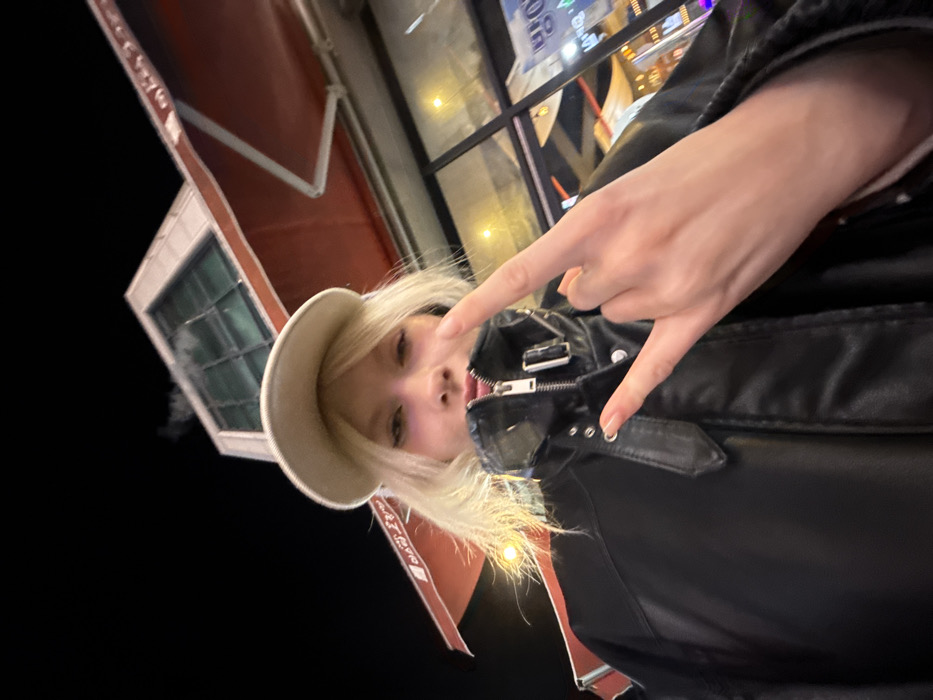 An image taken at night in Namyangju-si, South Korea, features a single individual, appearing to be a young female, captured from a low-angle perspective, from the waist up. She has blonde hair and is wearing a white baseball cap and a black leather jacket with a prominent silver zipper and a buckle on the collar. Her right hand is raised to chest level, displaying a "rock on" gesture with the index and pinky fingers extended. Her fingernails are painted a light color. The individual looks directly forward with a neutral to slight smirk expression. The background reveals an urban setting at night, with a dark sky. A building is visible behind her, featuring a red awning with Korean characters and a glass-paneled upper section from which smoke or vapor is rising. Reflections of interior lighting from a storefront or establishment are visible to the right of the subject.