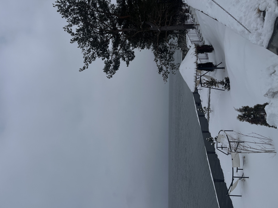This image captures a snow-covered winter scene overlooking a large body of water in Tsamakaberd, Armenia, likely Lake Sevan. The sky is uniformly overcast and grey, meeting the distant horizon above the dark grey water, which exhibits slight surface ripples. In the foreground, the ground is completely blanketed in deep, undisturbed white snow. A dark, low retaining wall or barrier runs horizontally along the water's edge across the left and center. Above this barrier, positioned on the snow, is a white fabric hammock-style daybed or swing, supported by a dark metal frame and partially covered in snow. Small, bare deciduous saplings and a single, small evergreen shrub are visible emerging from the snow near the daybed. On the right side of the frame, a large, dark green conifer tree, possibly a pine, stands prominently, its branches extending towards the top and center. Beneath this tree, a circular thatched umbrella or small gazebo, heavily laden with snow, is visible. Adjacent to it, a dark metal railing fence ascends a snow-covered slope towards the right. Two taller, conical evergreen shrubs are positioned near the umbrella structure. A dark chain is partially visible lying on the snow in the lower right corner. The entire scene is devoid of human figures, animals, or any discernible activity.