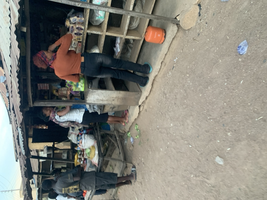 The image depicts an outdoor market scene in Rafin Par, Nigeria, featuring a roadside stall constructed from corrugated metal roofing and wooden supports