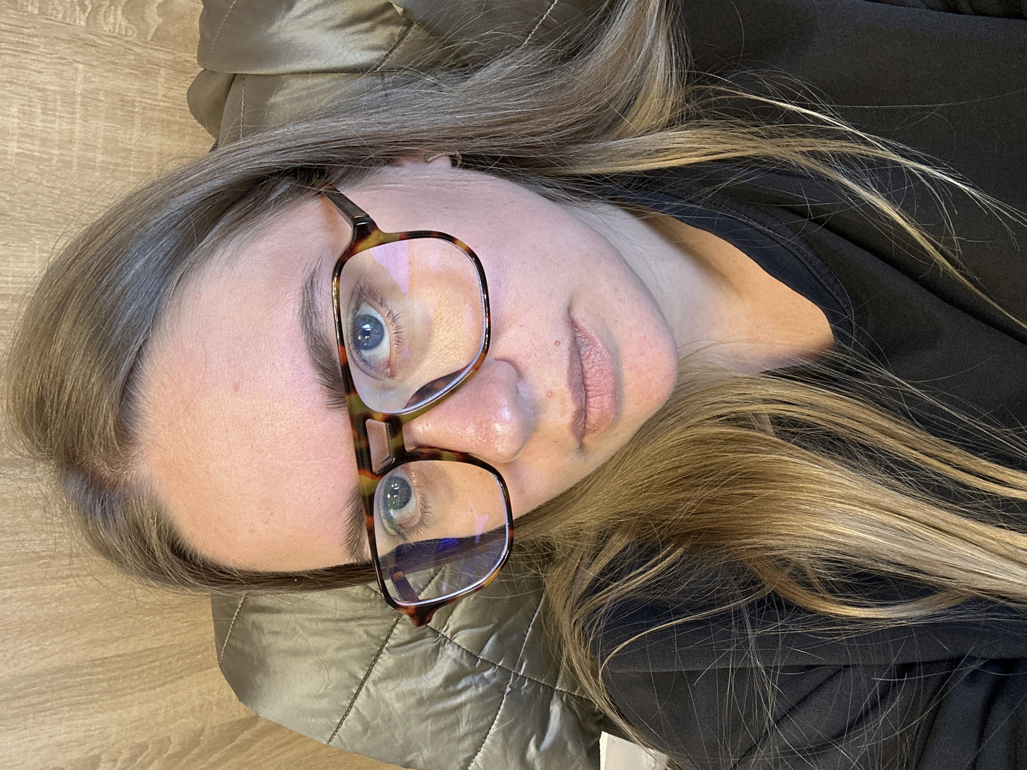 A woman with light brown hair and blue eyes, wearing tortoiseshell-patterned eyeglasses, is lying on a quilted surface