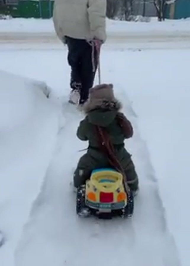 In a snowy scene, a toddler dressed in a green winter suit and a brown hat sits on a yellow and blue toy car. A man, wearing a beige puffer jacket and dark pants, pulls the child and the car along a narrow, snow-covered path. The backdrop features snow-covered houses and trees, under a cloudy sky. Snowflakes can be seen falling.