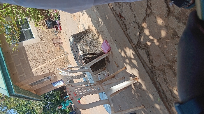 The image depicts an outdoor scene in Kuru, Nigeria, under bright daylight conditions. In the foreground, the lower body of an individual wearing white clothing and black sandals is partially visible on the right. The ground consists of a rough concrete slab in the immediate foreground, transitioning to unpaved dirt and gravel with sparse vegetation. Centered slightly to the left are three white plastic chairs with lattice-patterned backrests, positioned on the concrete surface. A pink plastic container, possibly a lunchbox, lies on its side on the ground near the chairs. Adjacent to the chairs, on the right, is a large, weathered concrete structure, possibly a wellhead or a planter, with a rough, textured surface. In the midground and background, a single-story building constructed of light-colored concrete blocks with a green metal roof is visible. The building features a single white-framed window with a security screen on its right side. To the left of this building, obscured by trees, another individual wearing a green patterned garment is partially visible. Further to the right of the building, near the base of a tree, several dark plastic bags, a black pot, and brown tile-like objects are present on the ground. Trees with green foliage are scattered throughout the scene, casting dappled shadows on the ground. The sky is clear, indicating fair weather.