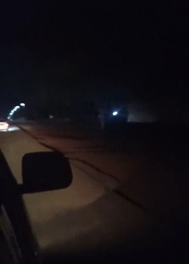 view from inside a car, likely from the passenger seat, driving down a dark road at night